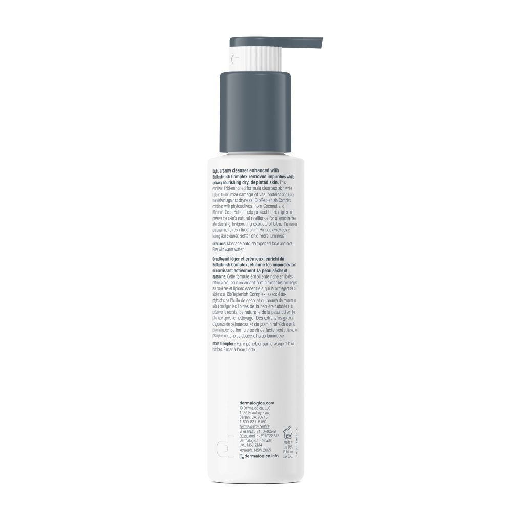 Light, creamy cleanser enhanced with BioReplenish Complex removes impurities while actively nourishing dry, depleted skin. This emollient, lipid-enriched formula cleanses skin while helping to minimise damage of vital proteins and lipids that defend against dryness. BioReplenish Complex, combined with phytoactives from Coconut Oil and Murumuru Seed Butter, help protect barrier lipids and preserve the skin’s natural resilience for a smoother feel after cleansing. Invigorating extracts of Citrus, Palmarosa and Jasmine refresh tired skin. Rinses away easily, leaving skin cleaner, softer and more luminous.